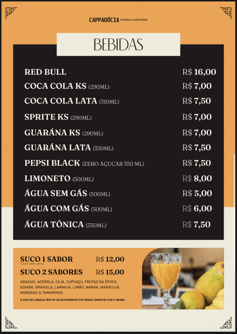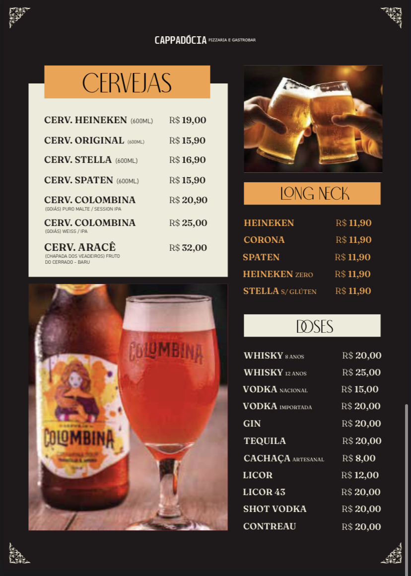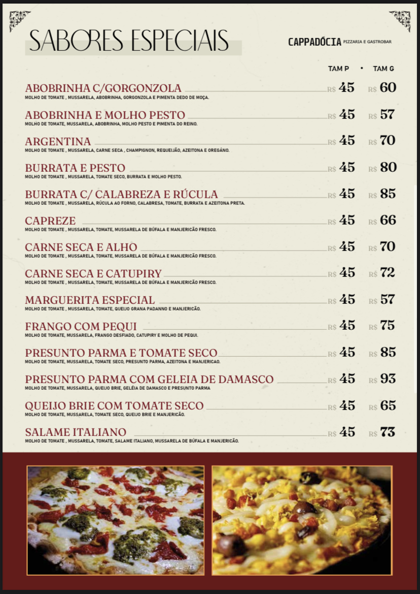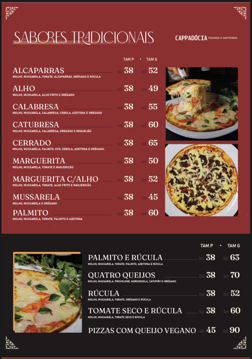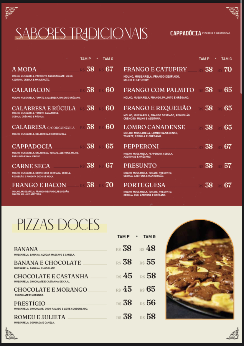Overall, the menu at Cappadócia | Pizzaria E Gastrobar offers something for everyone, combining traditional flavors with modern convenience. Whether you're dining in or ordering out, the restaurant ensures a high-quality culinary experience with every meal.